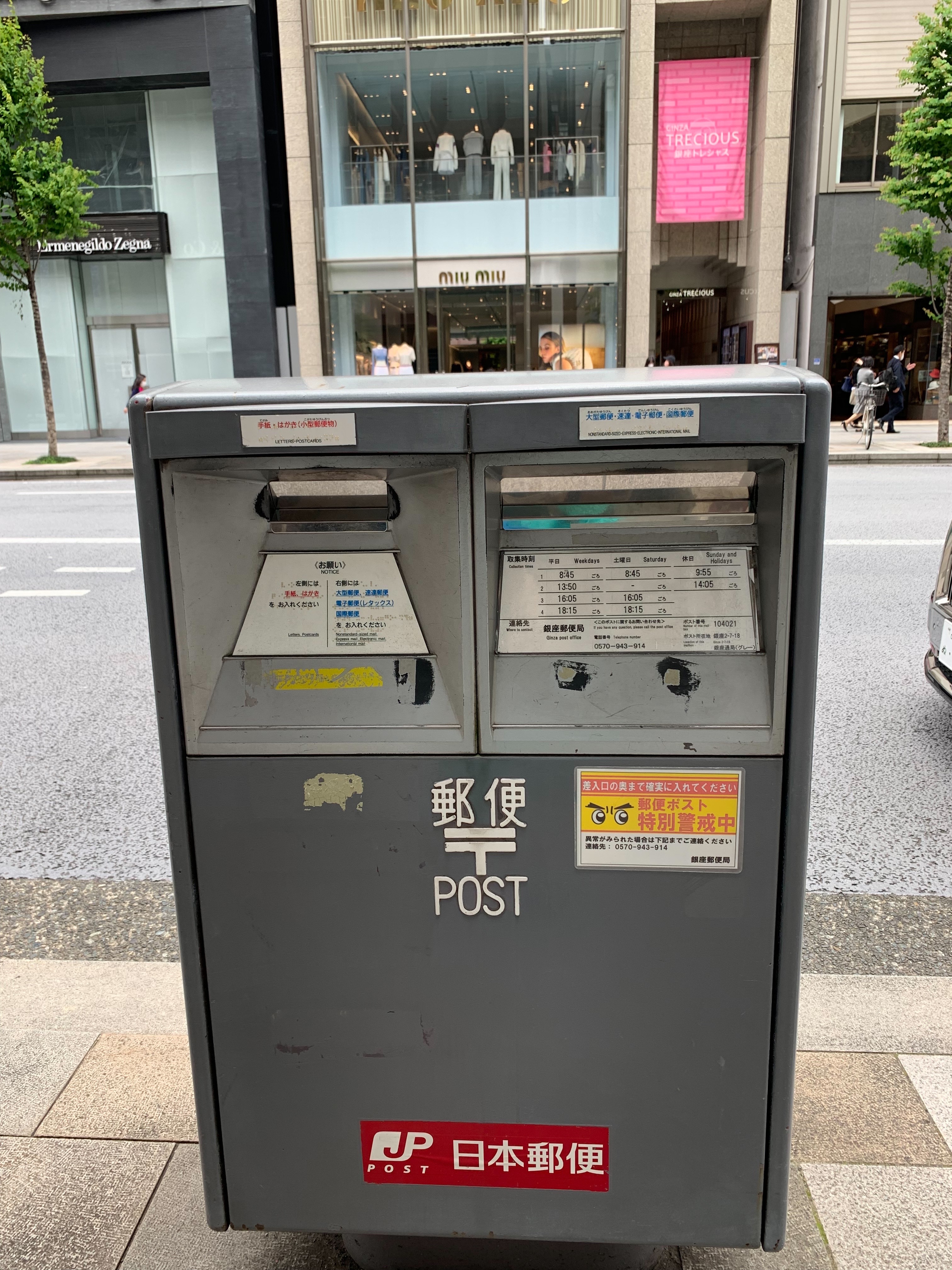 일부 관광지에서는 주위의 경관과 일치하게 하기 위해서 우편통을 다른 색으로 하는것도 보일수 있습니다. 긴자 2쵸메, 중앙 거리의 도보에 있는 긴자 우체국 앞에 있는 우편통은 회색으로 되어있습니다. 가로수길의 우편통은 파란색이고, 미츠코시 옆에 있는 우편통은 빨간색, 긴자의 거리에서만 3색의 우편통이 보일수 있는거 같습니다.