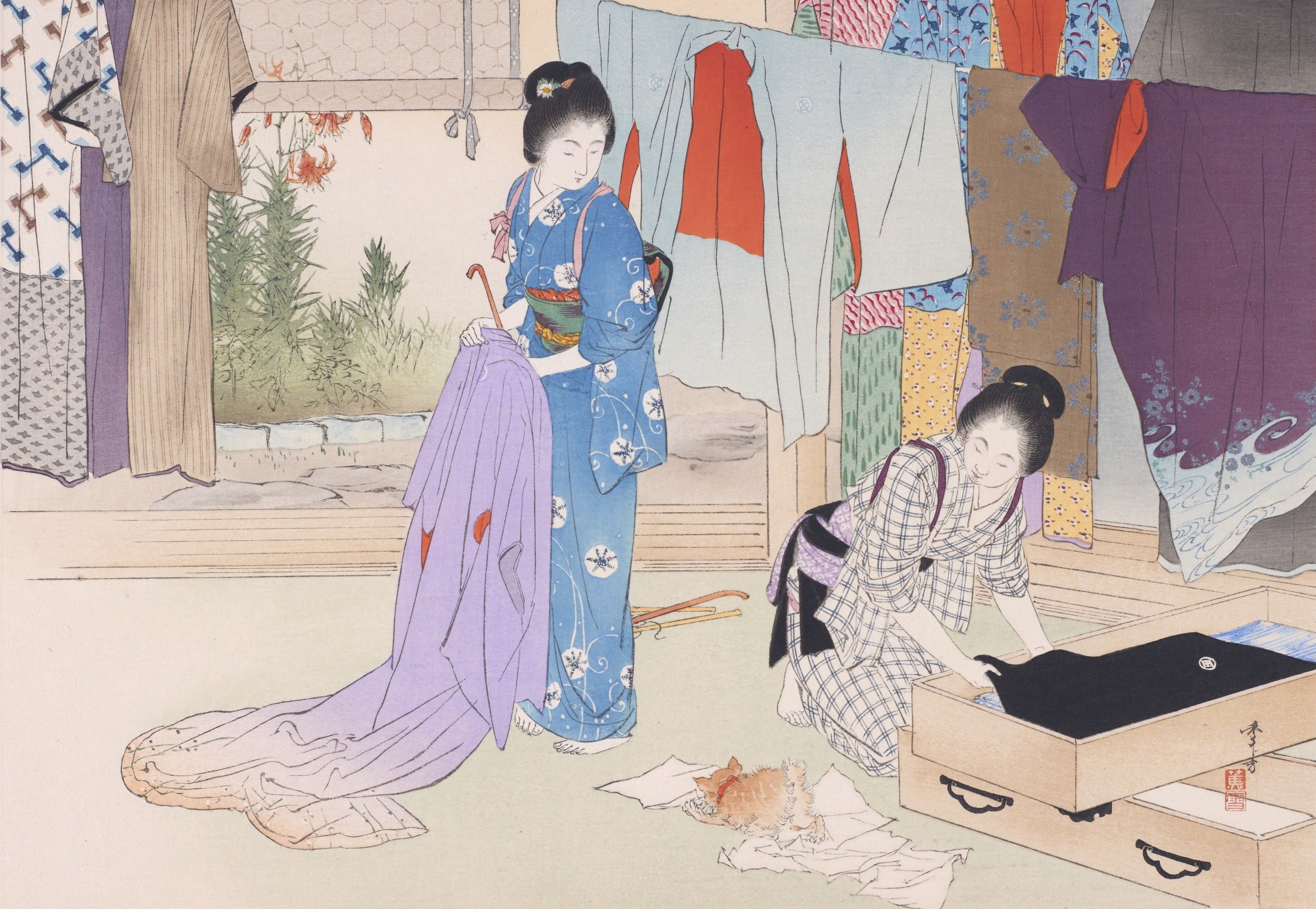 옷정리는 중국 궁정에서 시작된 습관입니다. 헤이안 시대 무렵의 일본에 전해져 처음에는 귀족 사회만의 습관으로 1년에 두 번 여름옷과 겨울옷으로 바꿨습니다. 그 후 에도 시대의 무가 사회에서는 사계절에 맞추어 연 4회가 되어, 환절기에서 아와세, 히토에, 카타비라, 와타이레 등, 기간을 세세하게 설정한 기모노를 착용하고 있었다고 합니다.