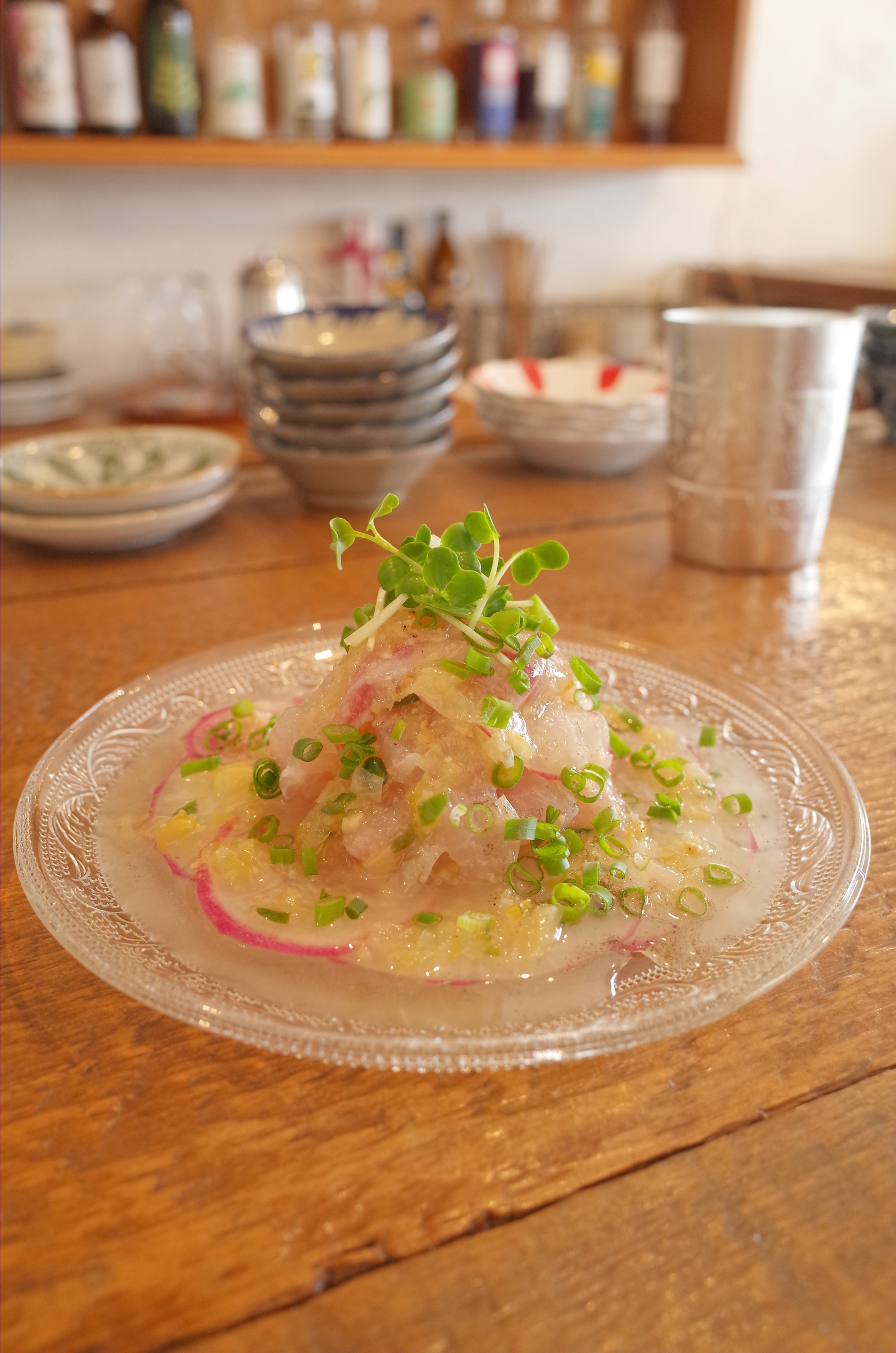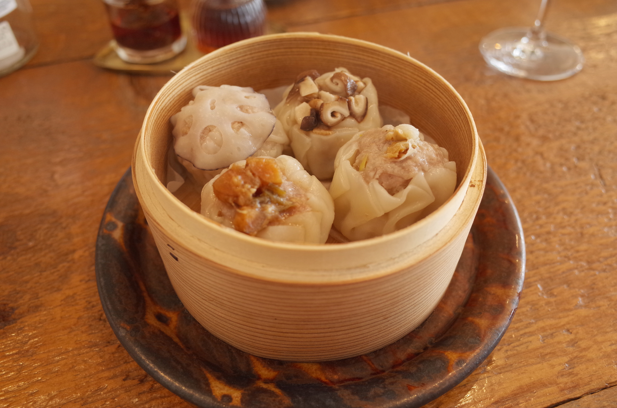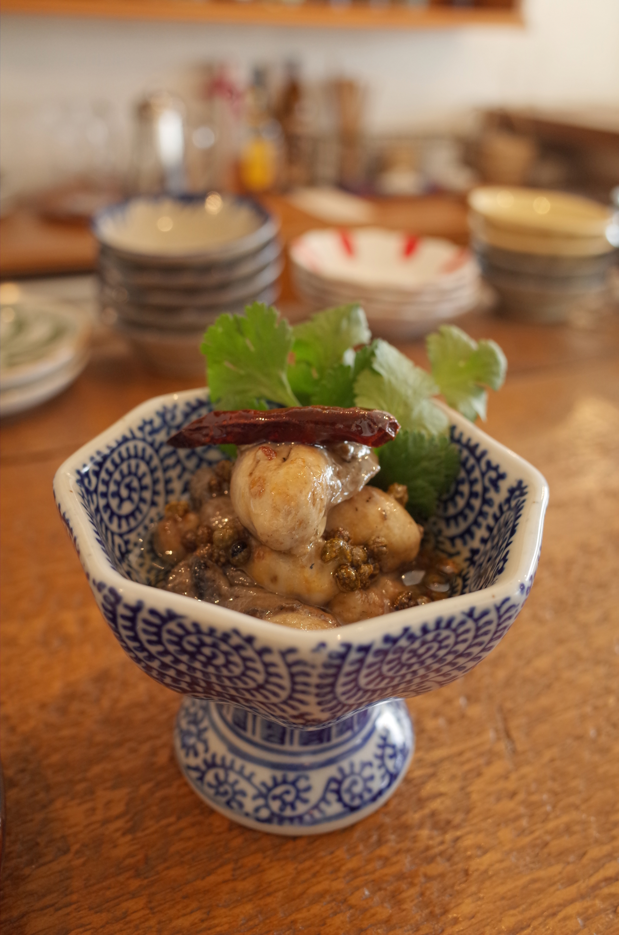 추천하는 슈마이는 카가 연근, 원목 표고버섯, 자연 재배 우엉 된장, 돼지고기, 가리비 등 엄선한 소재의 감칠맛이 꽉 응축되어 하나하나, 한입 한입을 소중히 먹고 싶은 맛입니다. 가게에서 만든 마라장이나 폰즈와의 궁합도 뛰어나고, 먹는 순서를 생각하거나 그에 맞는 술을 생각하는 것 또한 기대됩니다. 내추럴 와인의 안주로 주문한 굴의 청화자오 오일 절임은, 굴도 중식도 좋아하는 우리의 마음을 순식간에 사로잡는 맛입니다. 자연산 도미와 오하라 붉은 순무의 청마장(풋고추와 파의 소스)은 더욱더 술을 마시게 되는 향기. 중화뿐만 아니라 사용되고 있는 향신료와 허브에 어딘가 에스닉한 향기도 있고, 요리에 정통한 오너님의 센스와 타고난 세계관의 깊이가 전해지는 것 같습니다.