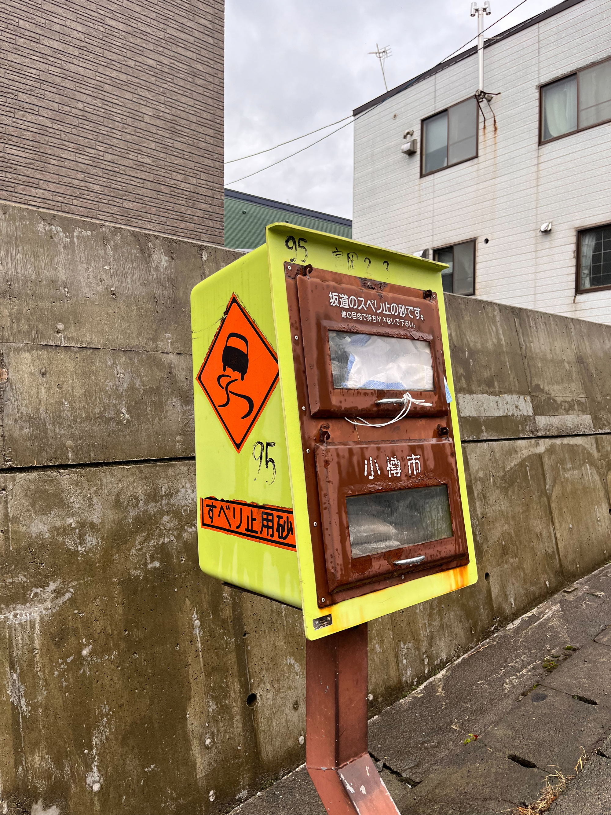 오타루에 사는 사람들에게 언덕길은 일상의 일부이지만 언덕길이 많은 도시에서의 삶은 결코 편하지 않습니다. 여름에는 가파른 언덕길을 오르면 땀이 솟구치고, 자전거로 이동하는 일은 거의 없습니다. 겨울에는 눈이 내려 쌓이기 때문에 겨울 신발이나 도로에도 미끄럼 방지를 위한 노력이 필수적입니다. 도로변에는 미끄럼 방지용 모래가 들어간 '모래 상자'도 설치되어 있습니다. 좁은 골목길이나 언덕길에서 차가 눈에 파묻히는 일도 자주 일어나 주민들끼리 힘을 합쳐 서로 의지하는 마음으로 겨울을 이겨내고 있습니다.